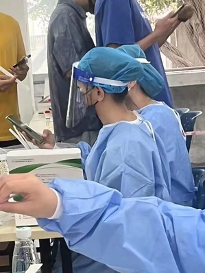 第一天我穿上了蓝色的防护服,戴上了面罩和口罩,在当时极其闷热的天气里,负责扫描同学们的核酸码。第二天我穿上绿马甲,负责引导队列方向的志愿工作。这两样工作都不轻松,第一天上午仅两个半小时我就已汗流浃背,第二天五个小时的连续站立和引导工作。这些工作让我对所有防疫工作者们有了更加深的敬意。