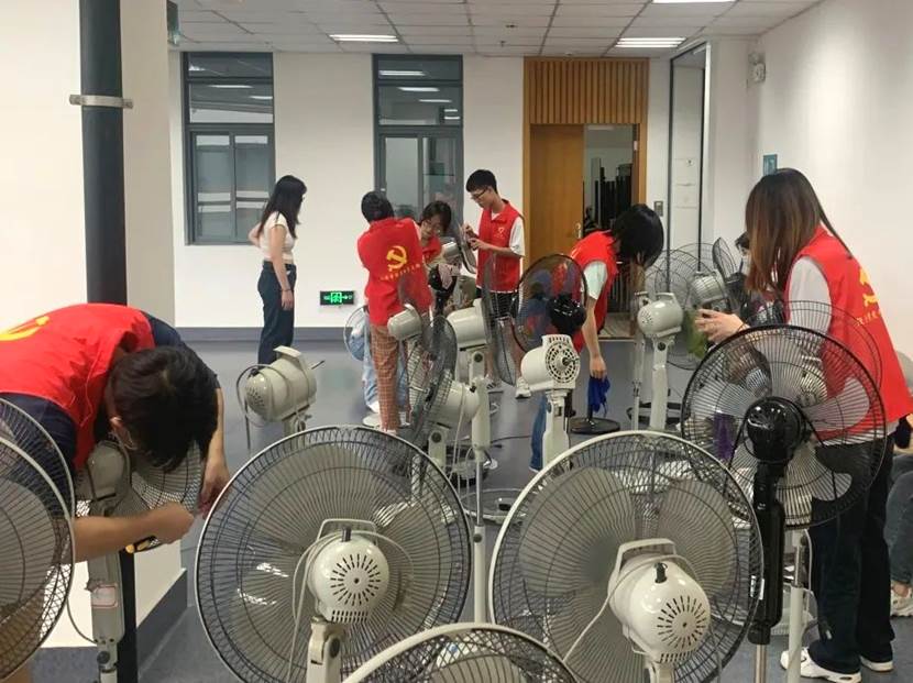 在图书馆老师的指导下,13名志愿者被随机分配工作任务,他们有的帮忙搬运风扇,有的负责打水清洗抹布,有的负责拆卸风扇,有的负责擦洗安装风扇。最后大家一起给八楼大厅收拾干净、清扫卫生,并将所有风扇归置原处。志愿者们不断穿梭在图书馆的八楼,各司其职、干劲十足、不怕脏不怕累,共同体验劳动的艰辛与快乐。