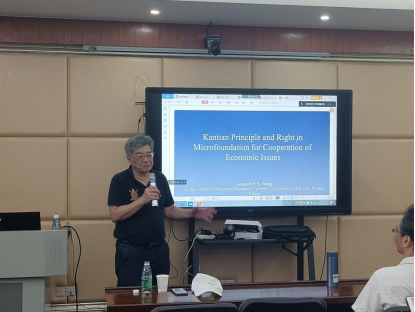 2023年5月31日下午,韦德1946APP官网在北二245举行学术讲座,邀请了中南财经政法大学文澜学院教授、博士生导师王凤生。讲座主题为Kantian Principle and Right in Microfoundation for Cooperation of Economic Issues。学院经理聂普焱教授主持讲座,学院辅导员肖静及韦德1946APP官网员工出席讲座。广州校区研究生和本科生到场学习,佛山校区保险专业研究生采取线上方式学习。